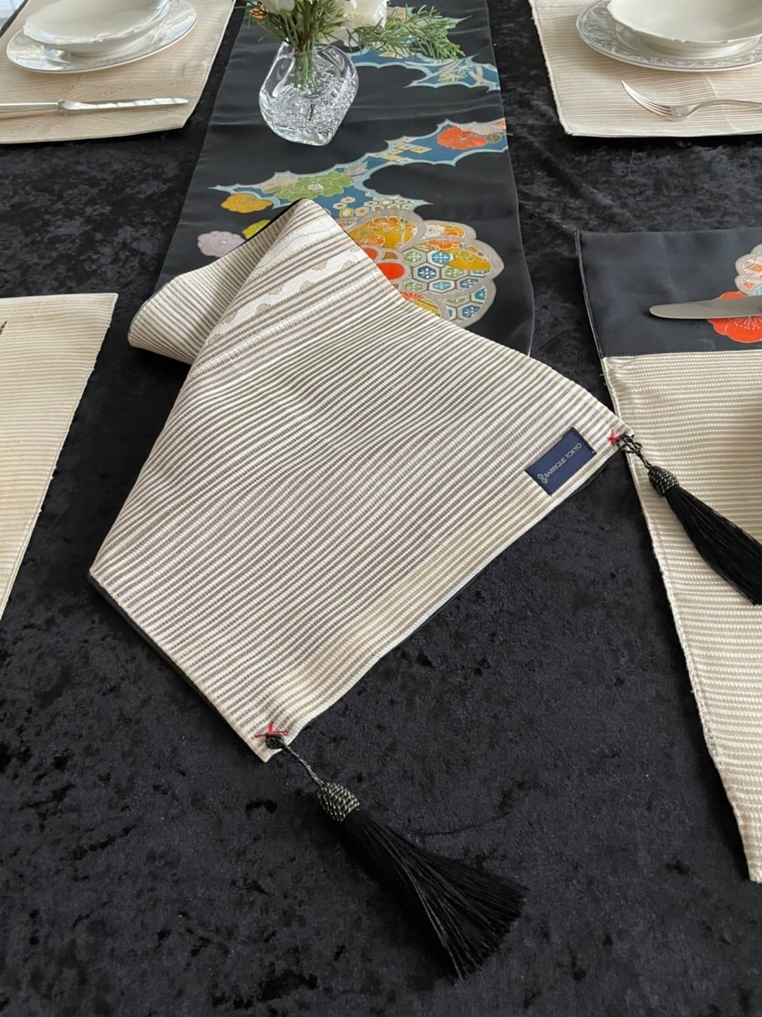 塩瀬(厚地の絹織物)の名古屋帯。裏には絽の帯(夏に締める帯)を合わせて、リバーシブルでお使いいただけます。フリンジも取り外し可能です。