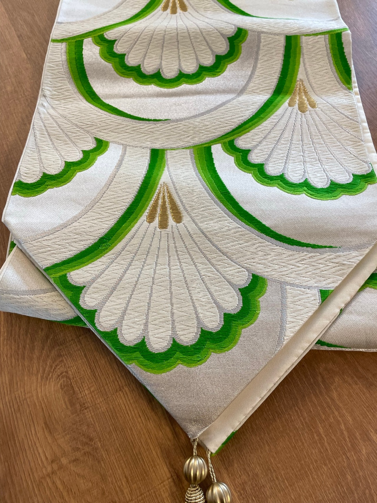 松青海波文様の袋帯。白地に緑の波紋様。涼しげながらです。