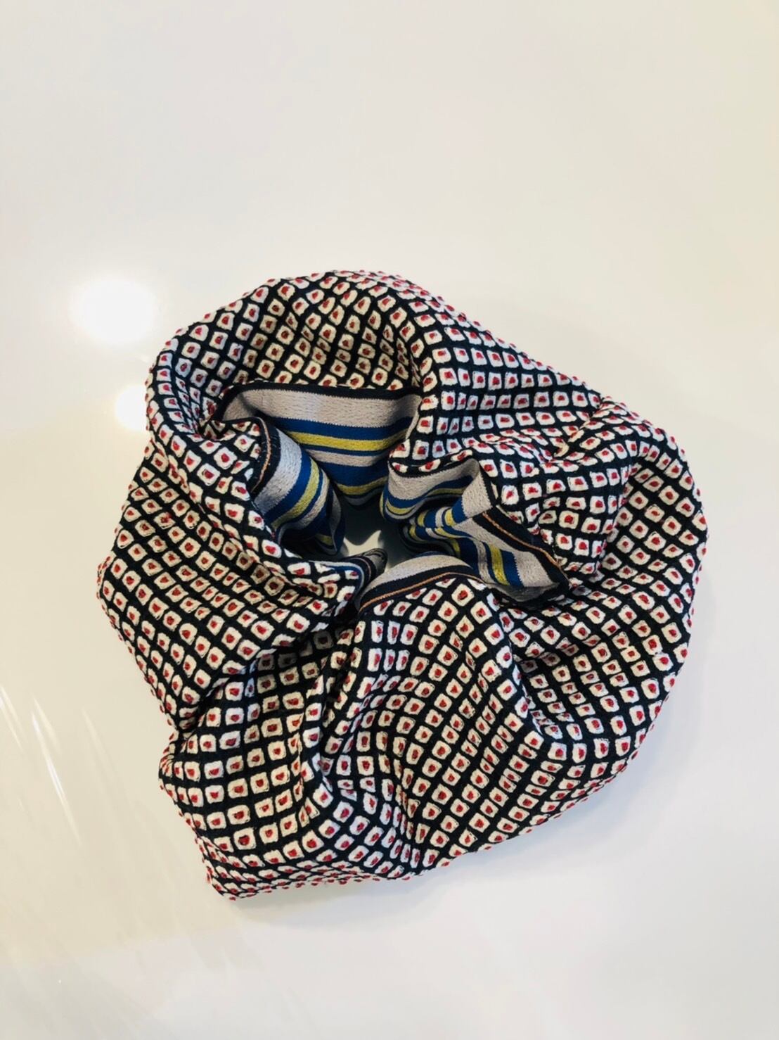 全体に絞り染を施した絹織物。総絞りにした模様が、小鹿の背のまだら模様に似ていることから、鹿の子絞りと呼ばれている着物からのリメイク。片面は、着物生地です。